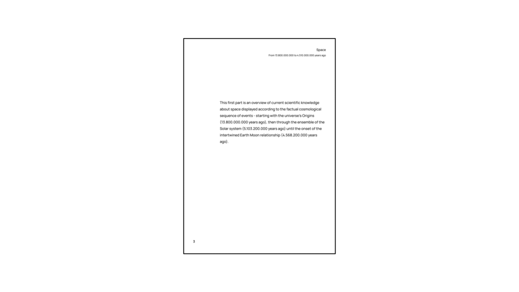 In its first part, called Space, Beliefs of a Female Architect offers an overview of what happened in the universe from the Big Bang to the formation of the Moon and Earth (based exclusively on empirical evidence) in accordance with the factual cosmological sequence of events. It starts with the universe’s Origins (13.800.000.000 years ago), then moves through the ensemble of the Solar system (5.103.200.000 years ago) until the onset of the intertwined Earth-Moon relationship (4.568.200.000 years ago).